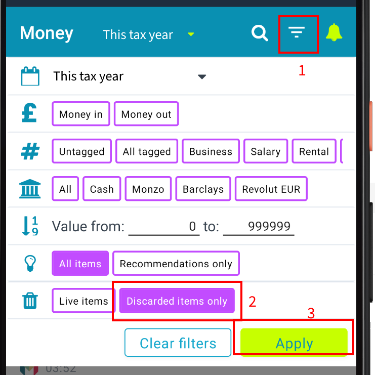 4. Check for discarded (deleted) transactions ... in the mobile app, tap on the filter button and choose "Discarded transactions only"