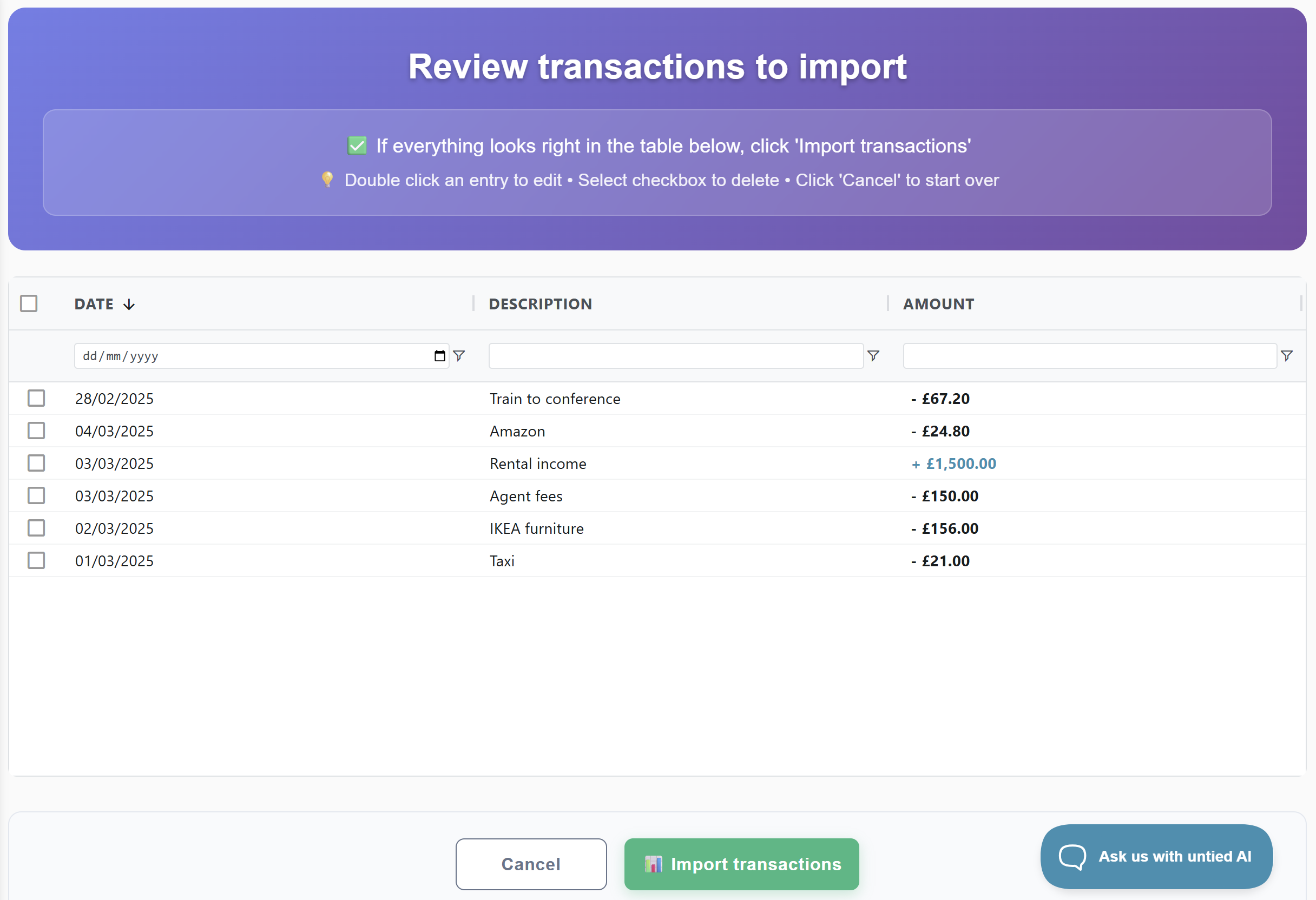 Made a mistake? You can also delete transactions after you've imported them.